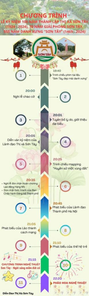 KÍNH MỜI NHÂN DÂN ĐÓN XEM: CHƯƠNG TRÌNH LỄ KỶ NIỆM 100 NĂM THÀNH LẬP THỊ XÃ SƠN TÂY (1924 – 2024), 70 NĂM GIẢI PHÓNG SƠN TÂY, 555 NĂM DANH XƯNG “SƠN TÂY” (1469 – 2024), CHÀO MỪNG KỶ NIỆM 70 NĂM GIẢI PHÓNG THỦ ĐÔ