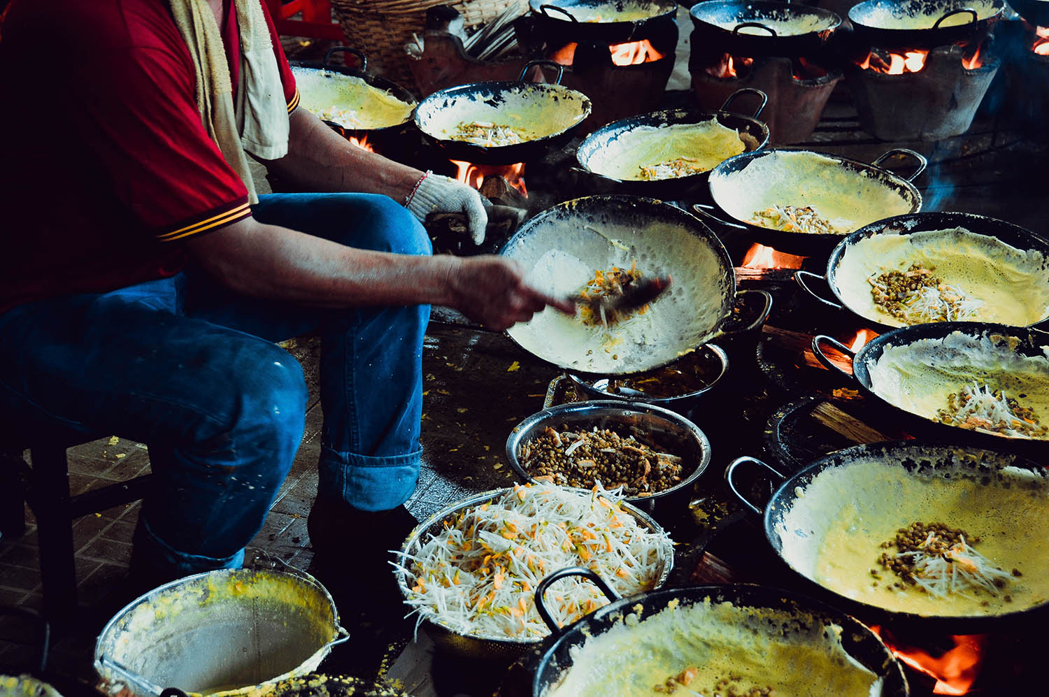 Bước chân vào khu bếp, bạn sẽ nhìn thấy ngay những người thợ đang đổ bánh xèo rất điêu luyện. Tay ai cũng thoăn thoắt, nhanh nhẹn, chảo này vừa tráng xong bột thì chảo kia cũng đã chín bánh. Bếp lò ở đây lúc nào cũng đỏ rực lửa và chảo bánh luôn luôn nóng dầu từ sáng đến chiều. Hiện tại chùa đã có hơn 10 người tình nguyện đổ bánh xèo chay. Được biết rằng, mỗi ngày tại đây thường làm ra khoảng từ 6.000 – 7.000 chiếc bánh xèo chay. Riêng dịp cuối tuần, ngày rằm, lễ thì chùa phải huy động 3 – 4 giàn chảo thì mới phục vụ đủ nhu cầu của các Phật tử và khách hành hương.